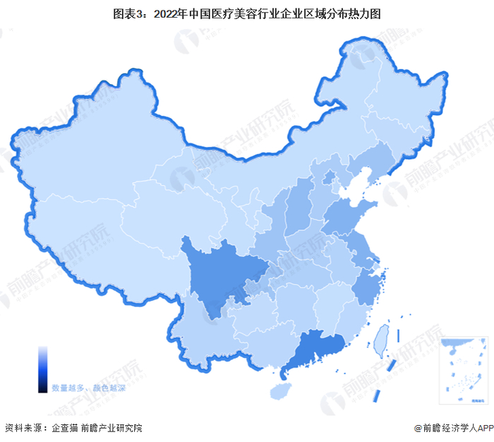 医疗美容产业链区域热力分布图:广东、四川数量较多