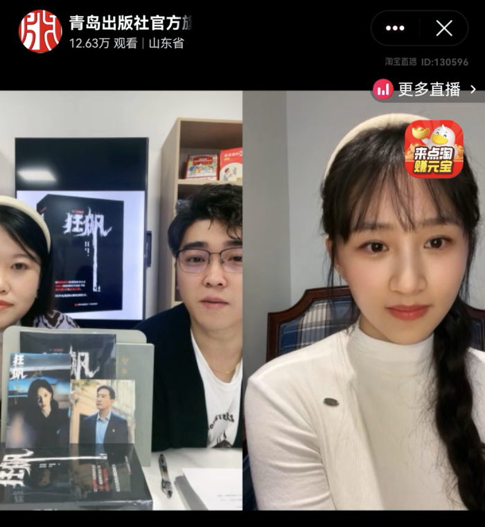 2月2日,《狂飙》同名小说出版方在“青岛出版社官方旗舰店”淘宝直播间举行首发式,老默扮演者冯兵、黄瑶扮演者程金铭“空降”直播间与网友互动。开播后,首批库存小说迅速售罄。据出版方初步统计,《狂飙》同名小说在全平台上架后,九成销量来自淘宝天猫,感叹“淘宝直播间网友太疯狂”。