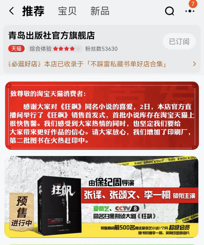 图片:青岛出版社官方旗舰店再次发布公告称,首批《狂飙》小说已售馨。