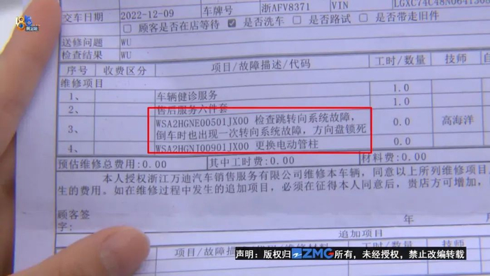 杭州比亚迪汽车王朝网杭州万迪4S店 张总:方向就是说偶尔会比较重,不是说锁死方向打不了,不是失效,是方向比较重,就是没有助力了,我们方向有电子助力的,不是说整个方向系统失效。虽然三包法上说了,如果是失效失控,那是它符合退车要求,但是目前我们判断出来不是方向失效,是助力没有了。