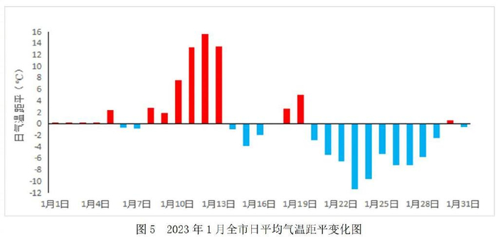 8-13日气温剧烈升高,偏高1.9~15.6℃,其中11-13日气温偏高13.4~15.6℃(图5)。“三九”本是一年中最冷时段,而今年1月11日(“三九”第3天)、12日(“三九”第4天)气温却“极为反常”,出现冰雪消融的“小阳春”。1月11-12日我市气温异常偏高,11日大部分区、县(市)最高气温达到0℃以上,尚志最高2.4℃;12日各区、县(市)最高气温达到1.5℃(木兰)~4.5℃(宾县),全市平均最高气温创下1961年以来1月中旬历史极值,其中除木兰居1961年以来1月中旬历史第2位外,其他区、县(市)日最高气温均创下1961年以来1月中旬历史极值。11-12日各区、县(市)均创下1961年以来历史同日极值。12日有9个区、县(市)最高气温居1961年以来历年1月份第1-3高位。