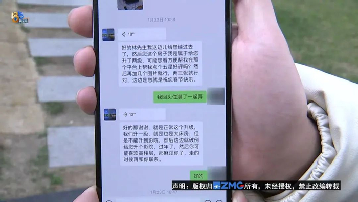 林先生提供了和前台工作人员的聊天记录。1月22号,对方提到给林先生的房间做了升级,希望能给个五星好评。当时林先生的回复是,回头住满了一起弄