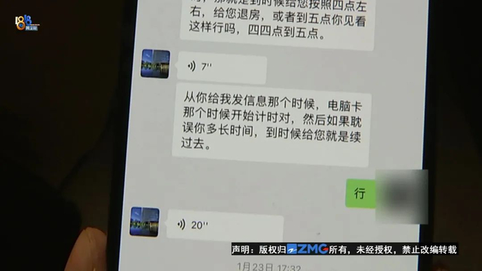 记者在双方的聊天记录了,看到了关于断网的内容。林先生说,当时房间的电脑出现了死机的情况。小古当时提出退房延后四个半小时,记录中,林先生只回复了一个字,“行”。