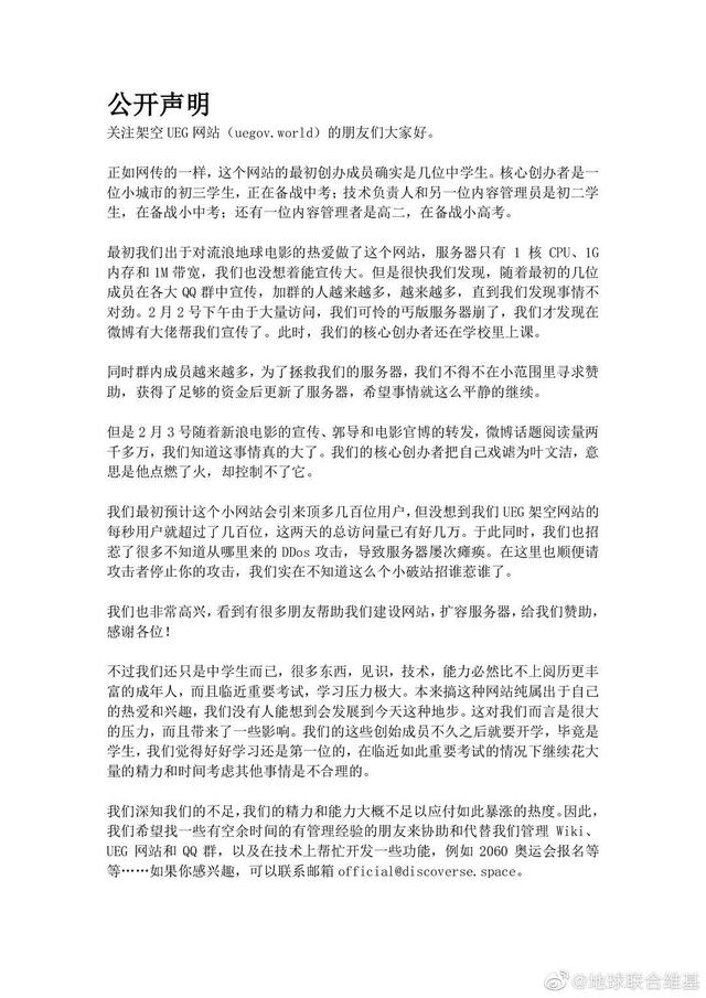 因为一波又一波的关注,让制作团队@UEG档案部始料未及,出现了不少突发状况。昨晚@UEG档案部发布声明表示,最初的创办者为几名中学生,即将开学的他们没有时间与精力维持站内运营,希望有“能人志士”代为管理。