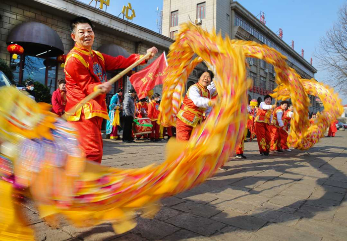 2月4日,民间艺人在江苏省连云港市连云街道舞龙。