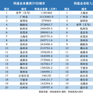 业务量位于榜首、以小商品闻名的义乌同样存在这个情况。去年义乌快递收入排在第四,次于上海、广州和深圳。