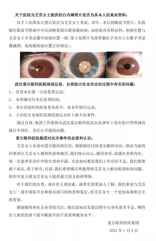 2021年1月4日,爱尔眼科曾发布诊疗过程核查报告,对艾芬提出的手术适应症、术前术后检查、手术资料真实性进行回应,认为诊疗过程无过错,但承认存在未明确交代术后复查时间、术后检查未完整记录、未及时上报不良事件等问题。