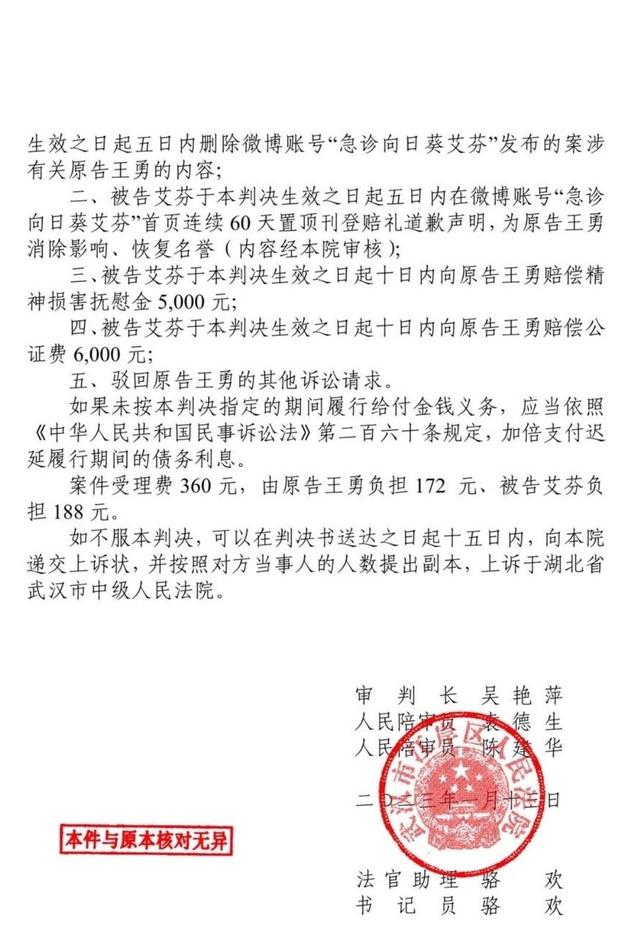法院判决,艾芬自判决生效之日起,五日内删除微博账号“急诊向日葵艾芬”发布的案涉有关原告王勇的内容;五日内,在其微博账号连续60天置顶刊登赔礼道歉声明;判决生效起十日内向王勇赔偿精神损害抚慰金5000元、公证费6000元。