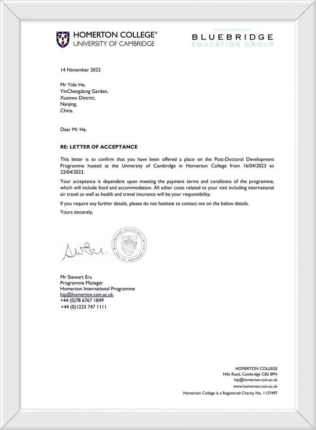 14岁接到英国剑桥大学博士后入站通知书(2022年11月)