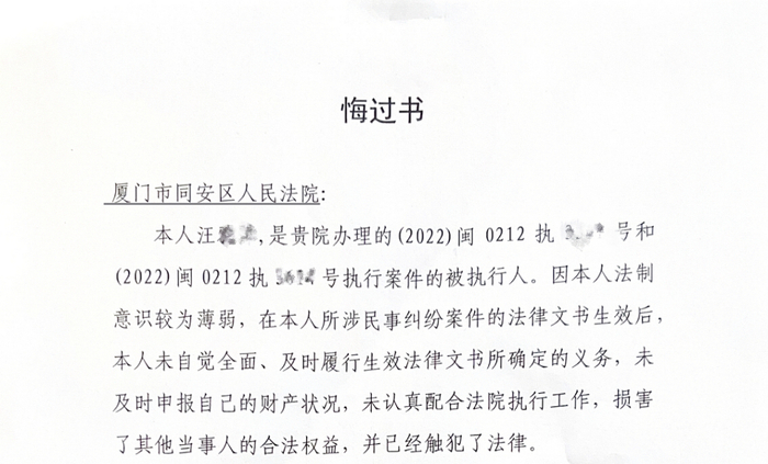 鉴于此,执行法官依法责令其具结悔过,向其送达《执行责令具结悔过通知书》。被执行人汪某某当场写了《悔过书》交给执行法官。