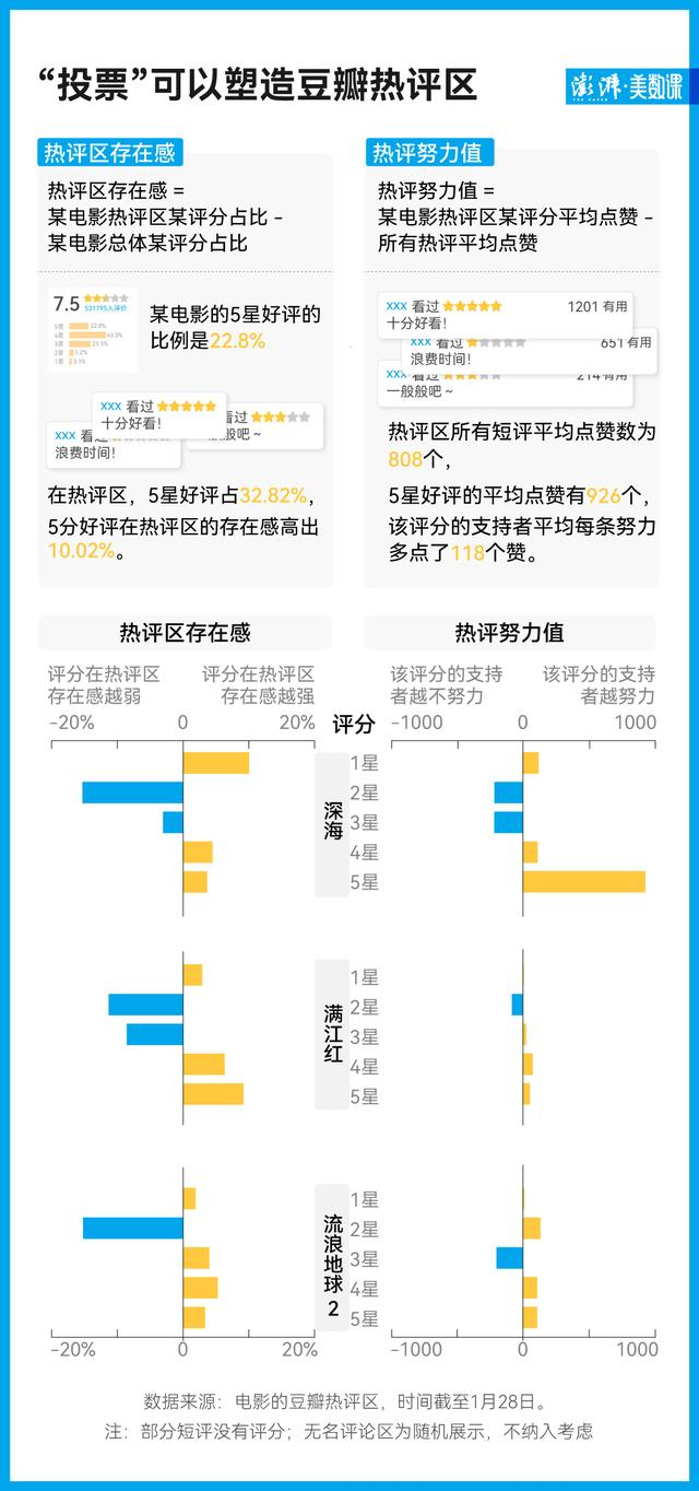 豆瓣在努力消除水军对评分的影响。然而从热评区的评分“割据”情况,我们能仍看出水军努力的痕迹:只要用力点赞,就能创造奇迹。点赞数越高,就越有可能进入热评区,这是“热评”的定义。