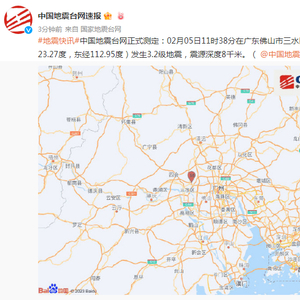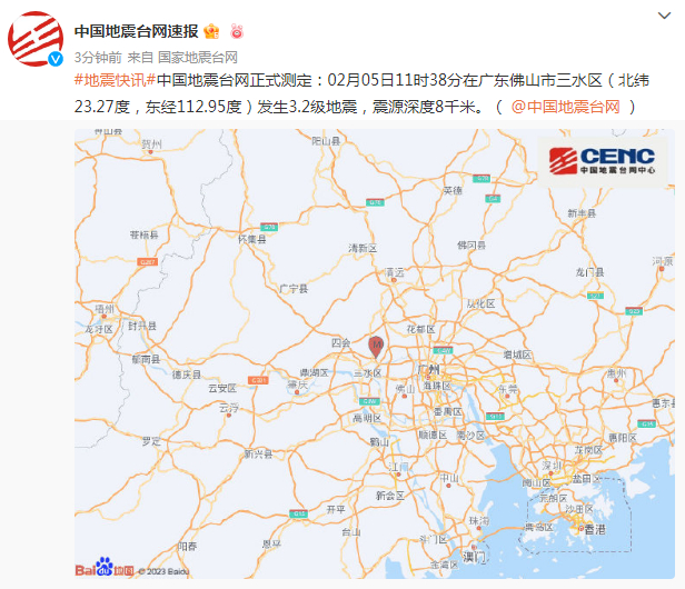 据中国地震台网正式测定,2月5日11时38分在广东佛山市三水区发生3.2级地震,震源深度8千米,震中位于北纬23.27度,东经112.95度。