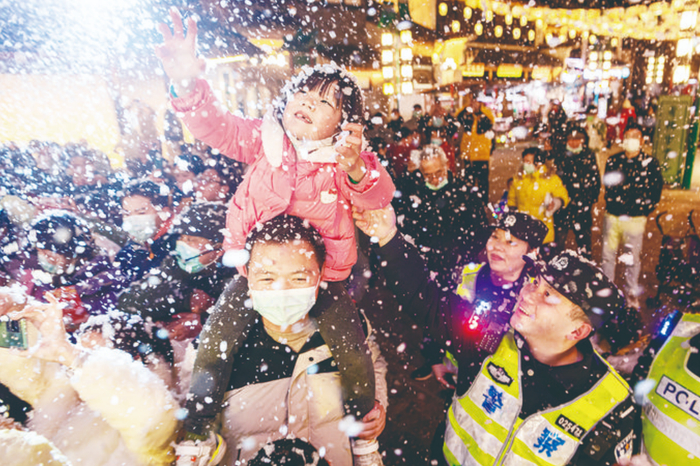 元宵节期间,天津市公安局西青分局民警守护杨柳青古镇璀璨灯火。王晓烨摄