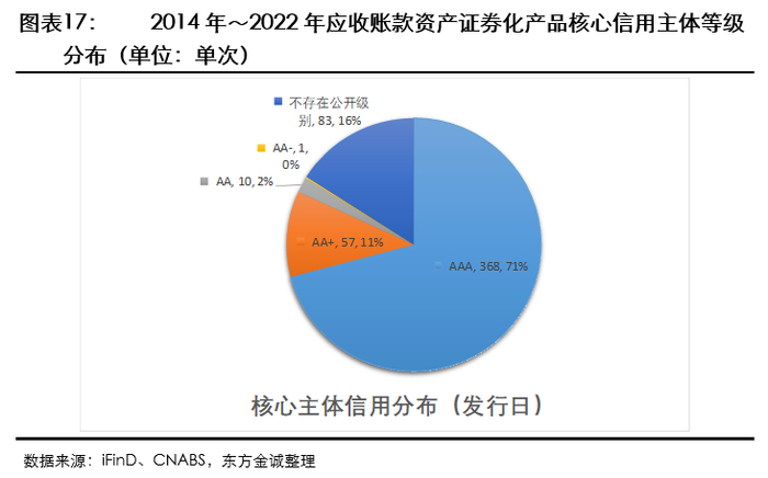 从核心主体的信用等级分布来看,在应收账款资产支持专项计划/票据项目发行日,71%的项目为AAA,11%为AA+,AA仅有2%,另外还有16%的项目的核心主体无公开信用等级。