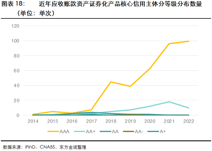 2022年发行的应收账款资产证券化产品中,核心信用主体为AAA级的项目继续增加,AA+级的项目下降,核心信用主体信用质量继续提升。