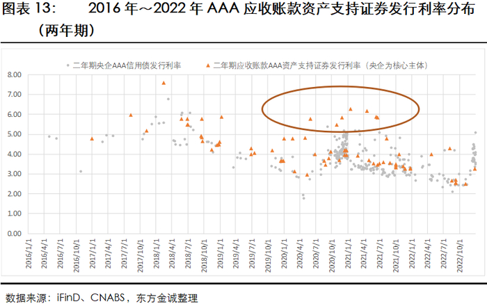 两年期应收账款AAA资产支持证券的发行利率和央企发行的两年期AAA信用债相比略高,部分高利率样本的项目,反映市场对其增信证券的信用等级认可程度偏低。