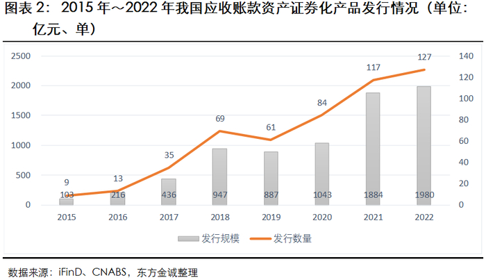 根据东方金诚统计口径[3],2022年应收账款资产证券化产品共发行127单,发行规模合计1980.05亿元,发行单数和规模分别同比增长8.55%和5.08%,均逆市增长。