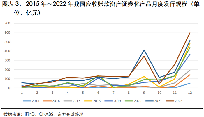 1.2022年应收账款资产支持证券发行逆市增长,发行单数和规模分别同比增长8.55%和5.08%;每季度末、年末是发行高峰期