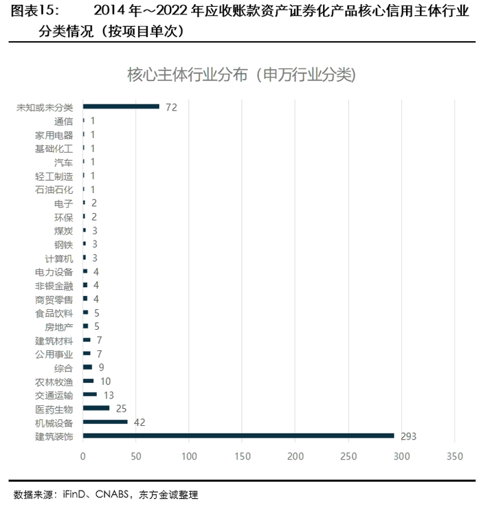 自2014到2022年累计519单应收账款资产支持证券样本项目中,从应收账款资产证券化项目的核心信用主体的行业来看,应收账款资产支持证券核心信用主体56%分布在建筑装饰行业(按项目单次统计),基础资产以工程类应收账款为主;8%分布在机械设备行业,基础资产以产品销售应收账款为主;5%分布在医药生物行业,基础资产以医药应收账款、贸易款为主。核心信用主体分布于交通运输、农林牧渔等行业的项目基础资产以贸易款为主。核心信用主体分布于综合行业部分项目基础资产或为补贴款。14%的项目无核心信用主体,或未知核心信用主体,或未分类。