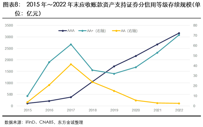 [3]本报告所提及的应收账款,不包含购房尾款、补贴款、票据资产等其他细分类型。统计口径包含资产支持证券、资产支持票据、信贷ABS。下文分析均采用东方金诚口径。