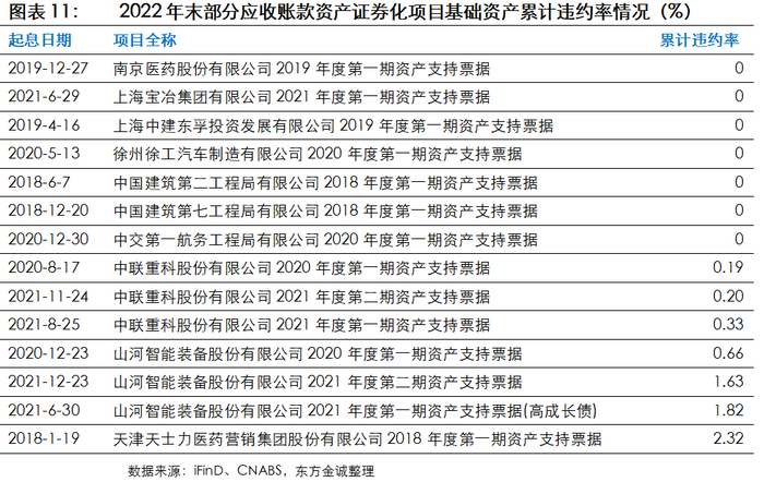 从应收账款基础资产池累计违约率的情况来看,截至2022年末,从ifind获取数据的14单项目中,7单项目累计违约率为0%,累计违约率最高的项目不超过3%。