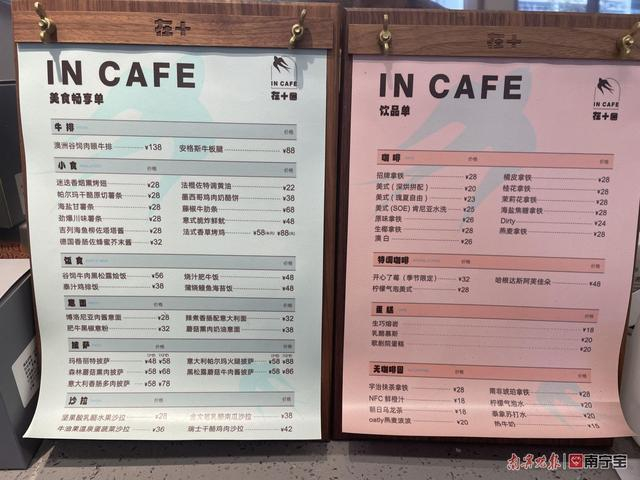 “在+社区咖啡”店菜单上,既有咖啡、各类西餐,也有无咖啡因饮料和季节限定饮品