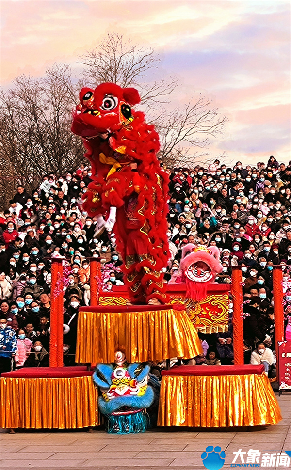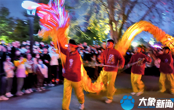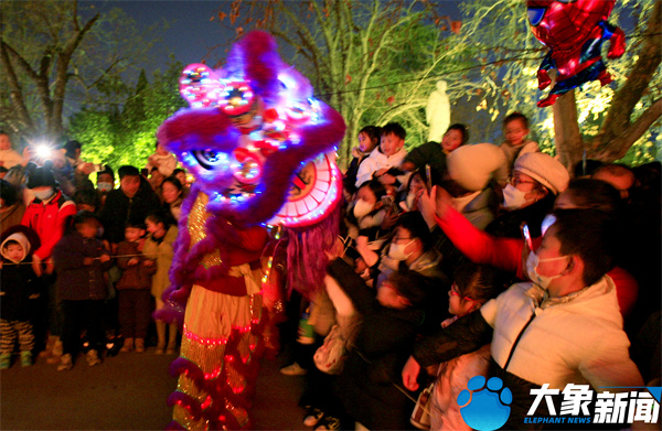 在洛阳市王城公园,国家级非遗的专业舞狮舞龙表演团队,以精湛的演技艺为市民和游客带来耍龙灯、龙灯舞、祥狮献瑞等表演,祈求万事吉祥,风调雨顺。夜幕降临,狮跃龙腾焕发出新的活力,将传统和现代相结合,融入动感,光耀新春,舞出青春。