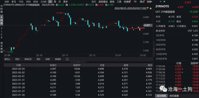 鲍威尔声称,2023年不降息,但是,市场预期2023年底降息2次25bp——对应2年美债4.10%。然而,大幅超预期的非农数据扭转了市场的“激进想法”。最终,市场跟联储达成临时性的一致——2023年不降息。