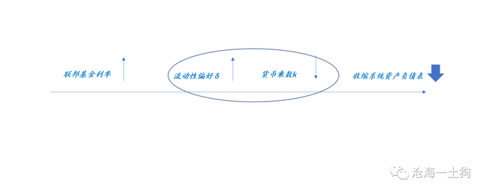 如上图所示,提高联邦基金利率导致流动性偏好上升+货币乘数下降,最后通过收缩非银来收缩系统资产负债表。