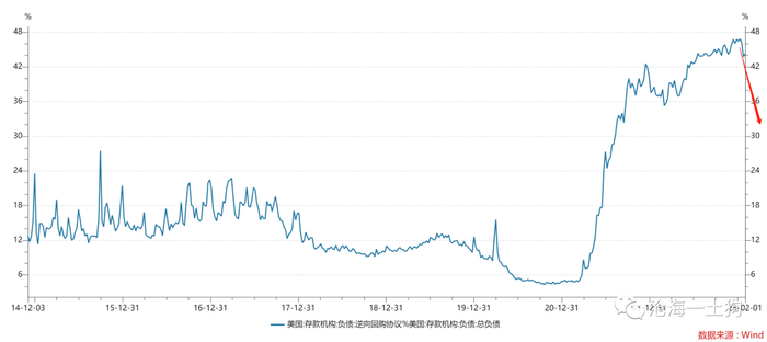如上图所示,逆回购已经占了美联储总体负债规模的40%+,这是极高的水平,疫情前的正常水平不过才是10%+,整整高了三倍。