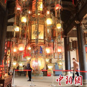 中新网金华2月5日电(记者 董易鑫)走进浙江金华东阳市卢宅肃雍堂,通高4.05米、直径2.10米、重127.5公斤,用40万颗玻璃彩珠穿就的大堂灯——宝盖索络联三聚七彩穗羊角灯流光溢彩,夺人眼球。