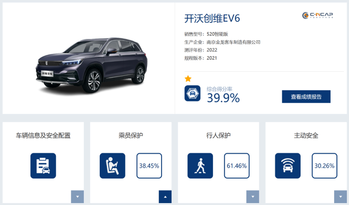 翻看创维EV6的C-NCAP测试报告,“乘员保护”一项的得分率仅为38.45%,其中碰撞测试总分64分,EV6得分29.371分。