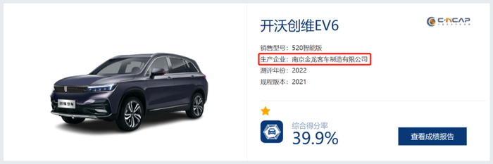 也就是说,所谓创维汽车的背后,实际上是创维创始人黄宏生的开沃新能源主导,创维只转让了一个商标。在中汽研创维EV6的C-NCAP测评结果上,可以清楚地看到生产企业是“南京金龙客车制造有限公司”。