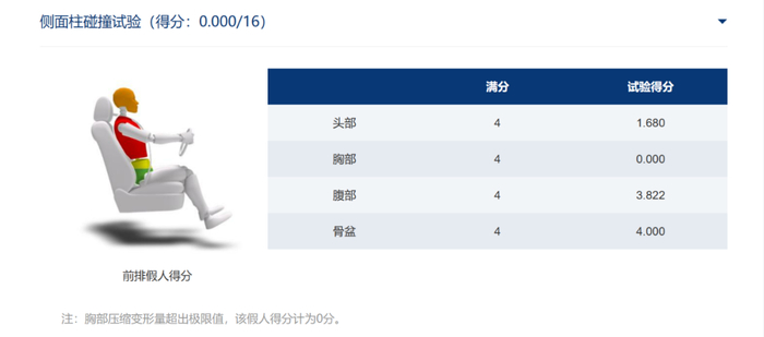最离谱的是侧面柱碰撞,总分16分,创维EV6得分为零。可惜中汽研不公布测试的视频和图片,真想知道EV6是不是B柱都给撞断了。车身侧面但凡有一点强度,也不至于16分,1分未得吧。