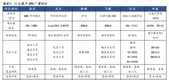 信创加快推进,CPU国产化先行。目前,国内共有海光信息、兆芯、龙芯中科、华为鲲鹏、飞腾信息和申威科技六家国产CPU厂商。六家国产CPU厂商均进入信创名录,获得工信部信创的认可。