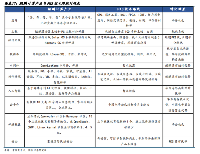 另一家采用Arm架构的国产CPU玩家飞腾,则基于PKS体系,在党政信创领域市占率领先,市占率高且产业链更为完整。孟灿对比鲲鹏与飞腾的生态构建,发现鲲鹏技术路线比PKS路线有较明显的技术和产品优势,PKS技术路线比鲲鹏技术路线有较明显的安全优势。PKS路线为信创工程提供内生安全、过程安全和供应链安全的全流程服务。