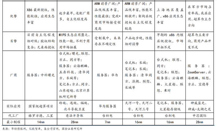 国内CPU厂商近年来奋楫前行,在工艺、性能、生态建设等多个层面不断取得突破,为CPU的自主可控、安全可信构筑了新的堡垒。国金证券孟灿表示,x86是当前PC及服务器市场的主流架构,海光信息、兆芯都采用x86架构IP内核授权模式。相较x86,走Arm路线自主化程度更高,华为鲲鹏、飞腾都获得了Armv8永久授权。龙芯中科、申威分别走的是MIPS、Alpha路线,自主可控程度相对更高。