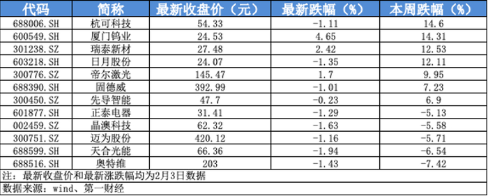 本周中证新能源指数(399808.SZ)下跌0.10%,在80只标的中,全周上涨标的40只,周涨幅在5个百分点以上的7只,其中杭可科技(688006.SH)周涨幅最高,为14.6%,厦门钨业(600549.SH)、泰瑞新材(301238.SZ)位居二、三位,周涨幅分别为14.31%、12.53%;全周下跌的标的39只,周跌幅在5个百分点以上的5只,其中奥特维(688516.SH)周跌幅最高,下跌7.42%。