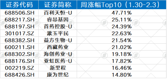 申万医药指数本周累计下跌1.15%,480只成分股中,全周上涨的标的有315只,其中累计涨幅超3%的有129只,累计涨幅超10%的有21只,次新股百利天恒一周累计上涨47.71%;全周下跌的标的有158只,其中周跌幅超过3%的有58只,另有7只成分股一周累计涨幅为0。