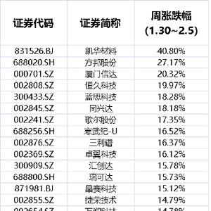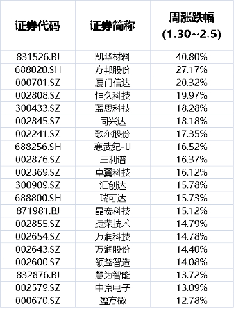 本周(1月30日~2月5日,下同)申万电子行业指数(801080.SI)上涨0.37%。电子板块429只标的中,扣除停牌标的,全周上涨的标的374只,周涨幅在10个百分点以上的39只。北交所的凯华材料(831526.BJ)周涨超四成,位居涨幅榜首;板块方面,本周ChatGPT概念表现抢眼,多日领涨。