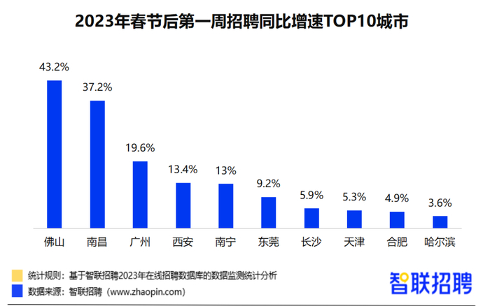 2023年春招季拉开帷幕。2月3日,智联招聘发布《2023年春招市场行情周报》(下称《周报》),在监测的38个重点城市中,佛山以43.2%的招聘职位数同比增幅,排名城市榜首位。