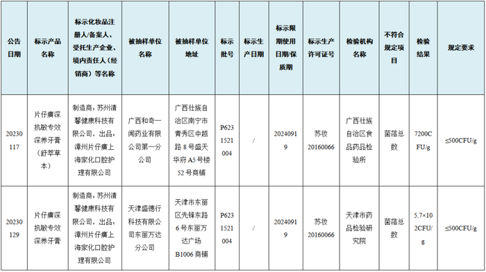 2023年1月17日,国家药品监督管理局发布《国家药监局关于56批次不符合规定化妆品的通告(2023年第3号)》,公告显示在2022年国家化妆品监督抽查工作中,片仔癀深抗敏专效滋养牙膏菌落总数超标,检验结果显示菌落总数高达7200CFU/g,合理菌落总数应不超过500CFU/g,超标14.4倍。