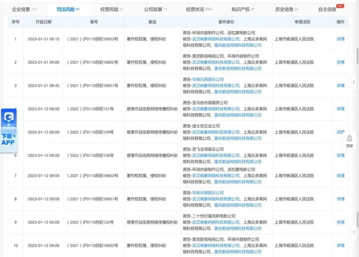 根据公开信息显示 ,仅在2023年1月,人人视频就新增10起被起诉的开庭公告,且全是与版权相关。以案号为(2021)沪0110民初16653号为例,原告是环球内容制作公司、派拉蒙电影公司,被告武汉映象网络科技有限公司、上海众多美网络科技有限公司、重庆剧迷网络科技有限公司,案由是著作权权属、侵权纠纷。
