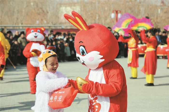 2月5日,参加十四师皮山农场“锣鼓闹春”社火表演的演员和小朋友互动。 马春燕 摄影报道