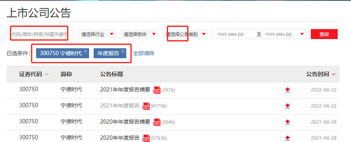 3、输入股票代码及查询条件,这里输入宁德时代代码,输入年度报告查询,查询结果如下,所有年度财务报告就出来了。