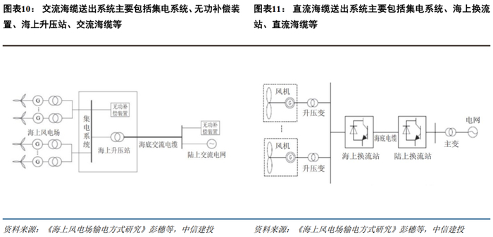 采用交流方案的好处包括技术方案成熟度高、近海输送成本较低、结构简单、可靠性高、工程运行经验丰富等优点。与陆上风电类似,风机出口35kV通过升压站逐级升压,最后视容量大小采用220kV、330kV、500kV等电压等级送出。采用柔直方案的好处包括长距离输送容量更大,输电线路数量更少;有功无功解耦,电压控制简单;可向无源电网供电等。