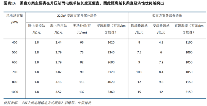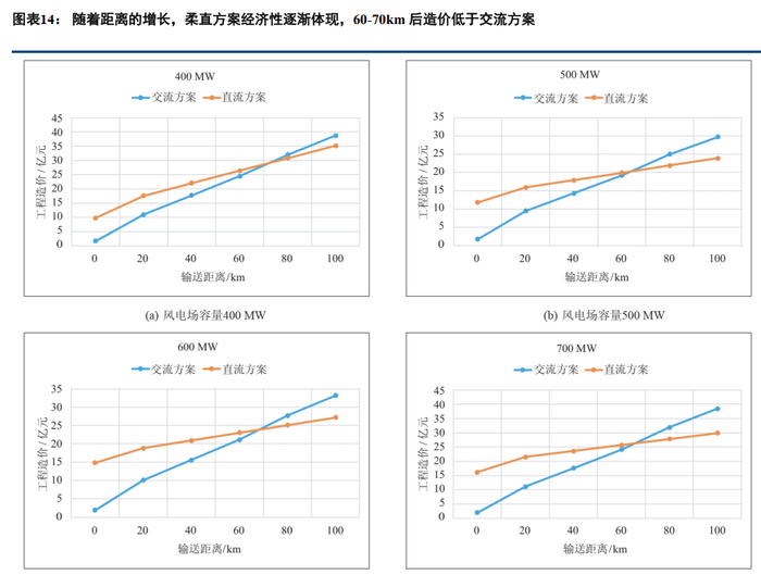 而采用柔直方案时,由于柔直换流阀等电力电子设备造价较高,因此主要贵在换流站,但在海缆上,相比于交流方案,由于输送同样容量时导体总截面更小,因此距离越长,柔直方案相比交流方案越省钱。