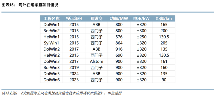 当前海外柔直送出经验并不丰富,主要集中在德国北海BorWin、DolWin、HelWin、SylWin四个集群,最高的直流电压等级为±320kV,最大已投运的项目容量为916MW;我国青洲五七项目直接挑战±500kV、2000MW柔性直流送出项目,技术难度远高于海外其他项目。