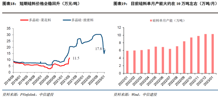 主材:硅料短期价格上扬,主要是因为料厂检修以及主动增加库存所致,我们认为持续周期不会很长,预计Q2硅料价格有望迎来新一轮下跌。持续看好电池组件环节,一方面上游硅料降价后电池组件环节盈利提升,从组件企业签单价格来看,Q1交付的订单主要是2022年Q4签订的订单,整体价格较高,预计Q1一体化组件盈利能力较强另一方面头部企业依靠品牌、渠道优势,份额有望提升。