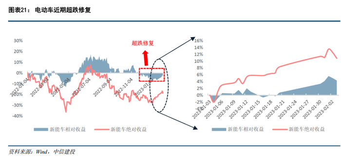 行情复盘:本轮反弹主要系超跌修复,并非超预期带来。2022年7月,市场出于对未来销量增速下行、行业供给侧过剩竞争格局恶化的担心而引发下跌行情,至23年1月4日新能源车绝对收益下行25%,对应wind一致预期的当年估值中枢为15-20倍,而2023年市场对电动车销量的预测主要集中在850-950万辆,同比增长23%-38%,增速与估值有较大偏离,在销量、业绩、政策等多重预期修复下进入超跌修复行情。